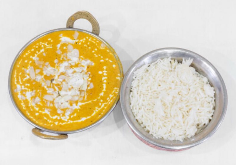 hausgemachter Rahmkäse in Sahnesauce mit Rosinen, Cashewkernen und Mandeln, mit Reis. A, G, H